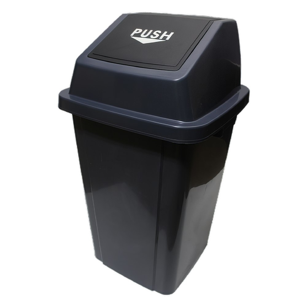 Contenedor de basura de diseño rectangular fabricado en plástico de alta resistencia, ideal para la gestión eficiente de residuos en interiores y exteriores techados. Destaca por su tapa de sistema basculante (vaivén) que incluye la leyenda “PUSH” en color blanco y una flecha indicadora, lo que facilita un uso intuitivo y mantiene los desechos fuera de la vista.